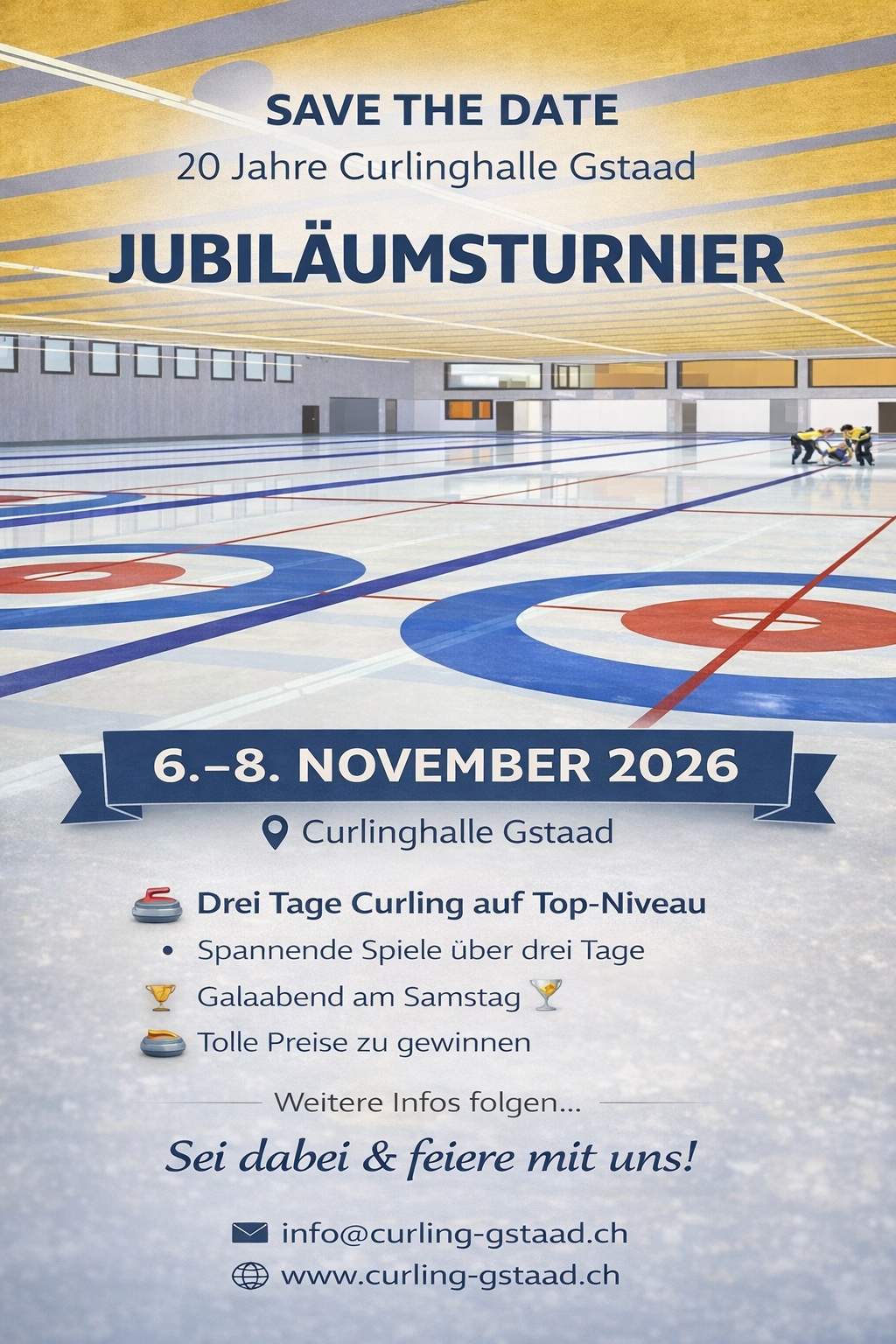 | Octobre 2026 | 9-11 | Tournoi Golf & Curling: Flyer FR ➚ Flyer DE ➚ Inscriptions: ➚ | Nouveau: sur 3 jours avec 18 équipes. Inscriptions ouvertes. (reste 8 places) |
