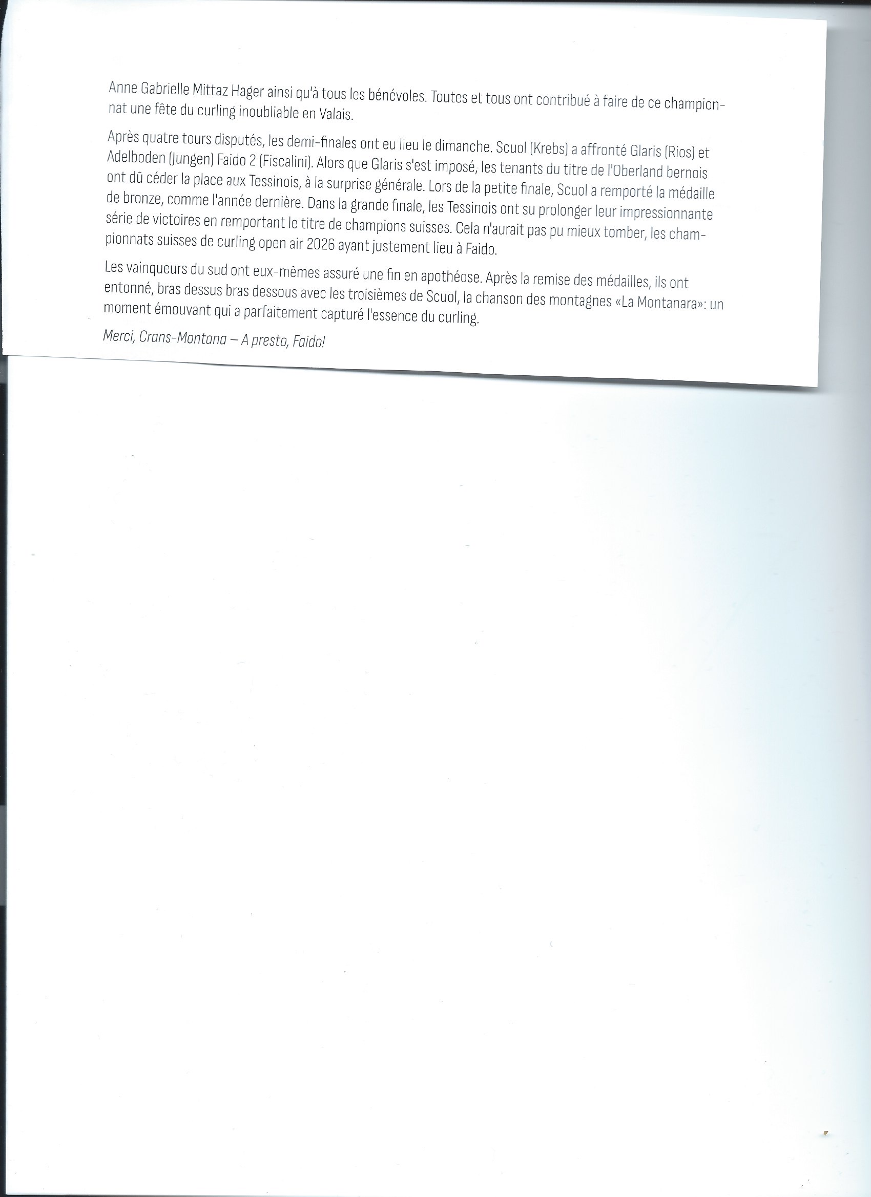 L’équipe de Crans-Montana échoue une nouvelle fois en 1/2 finales, contre Zermatt, malgré avoir mené 8-5 au 6 ème end, l’équipe locale négociait mal les 2 derniers ends, et prenait 2 coups de 3 de Zermatt  qui ont été rédhibitoire pour notre équipe (composée de Fabrice Apothéloz, Anne-Gabrielle Mittaz Hager, Christian Ott et Pierre-Alain Beney).